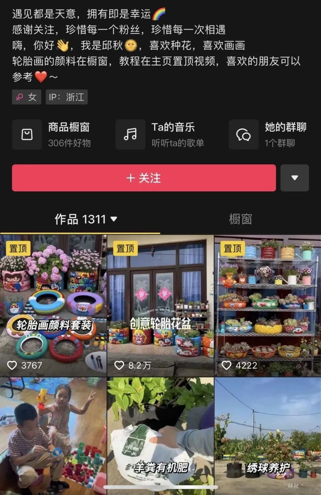在家人的支持下,去年4月,邱燕华尝试用视频记录自己的生活,制作手绘轮胎教程、分享花草种植经验,精准的定位吸引了7.7万粉丝关注,多家与园艺、颜料相关的商家也纷纷抛来合作“橄榄枝”。