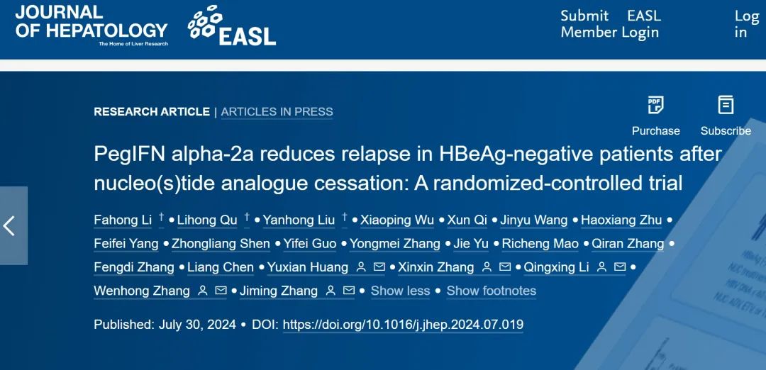 2024年7月30日,复旦大学附属华山医院张继明/张文宏团队、温州医科大学附属第一医院李庆兴团队、上海交通大学医学院附属瑞金医院张欣欣团队等在Journal of Hepatology(IF=26.8)在线发表题为“PegIFN alpha-2a reduces relapse in HBeAg-negative patients after nucleo(s)tide analogue cessation: A randomized-controlled trial”的研究论文,旨在探索核苷(酸)类似物(NUC)如何降低病毒学复发率以及获得更高的功能性治愈。