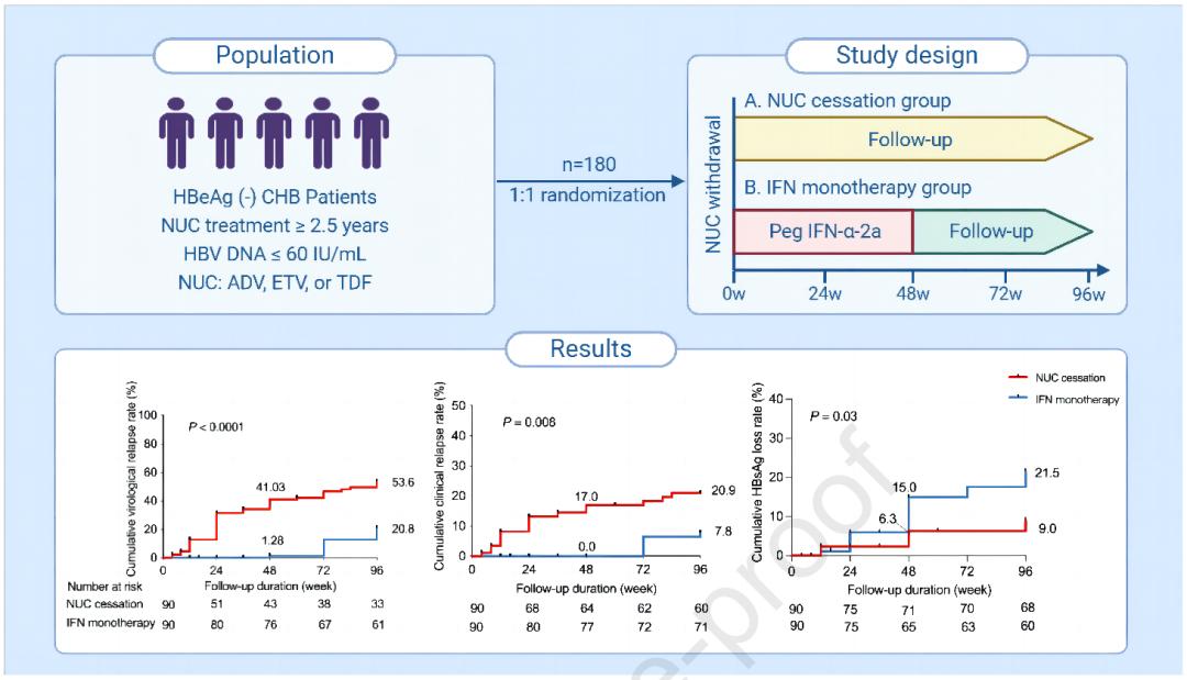研究显示,截至第96周,干扰素单药治疗组的累积病毒学复发率(20.8% vs. 53.6%,P<0.0001)显著低于NUC停药组,HBsAg损失率(21.5% vs. 9.0%,P=0.03)高于NUC停药组。