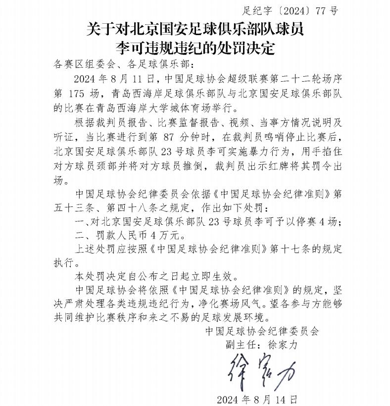 关于对北京国安足球俱乐部队球员李可违规违纪的处罚决定