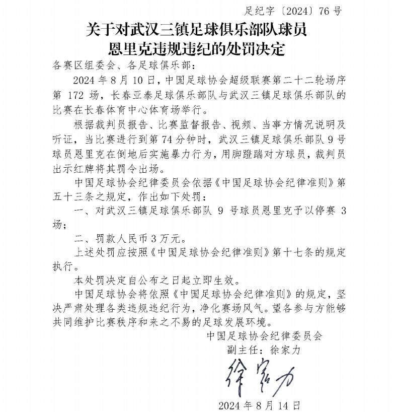 关于对武汉三镇足球俱乐部队球员恩里克违规违纪的处罚决定
