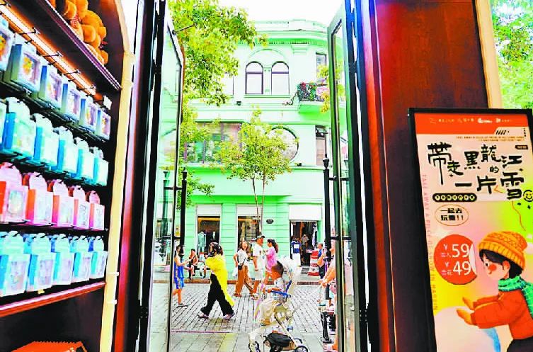 8月2日,游客经过中央大街一家文创礼品店。一条街,百余年,几代人。在这条老街上,有东北地区第一次党代会遗址、哈尔滨国际交通局、天马广告社……“摩登、时髦”的马迭尔宾馆是新政协筹备活动旧址、第一届全国政协会议在哈联络处。