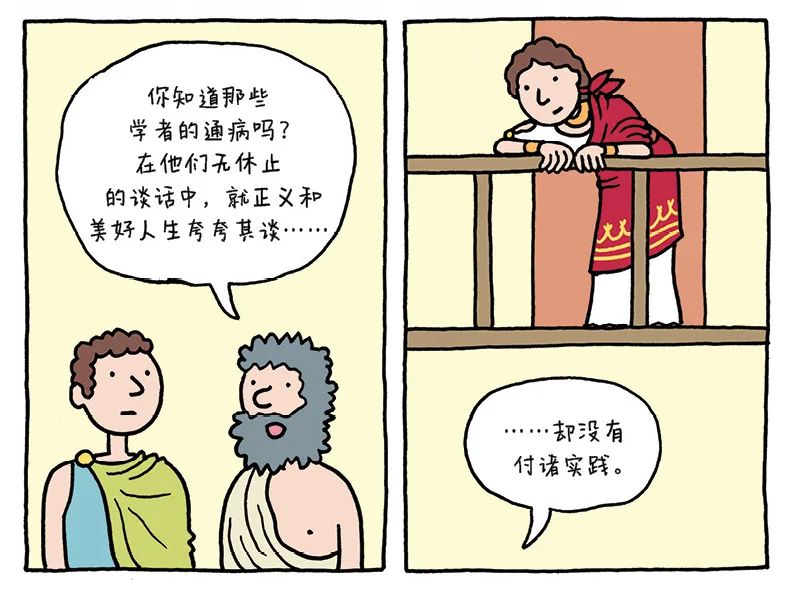 我还记得,第一次接触哲学是我在乐队里担任鼓手的时候。吉他手Tuuk是学哲学的,在我们固定聚会的酒吧里有时我们会广泛讨论相关内容。我因而发现青少年时困扰我的问题,其实是哲学问题。什么是好,什么是坏?又该如何生活?我在格罗宁根大学注册了几门哲学课程。当时是一九九六年,我二十六岁,刚刚开始制作漫画。我发现课堂上关于道德、真理和社会的理论非常引人入胜,好像有什么东西触动了我。我想:现在我知道我的人生想要什么了。将来,等我掌握了漫画这个媒介之后,我要把这些哲学理论融入我的漫画中。