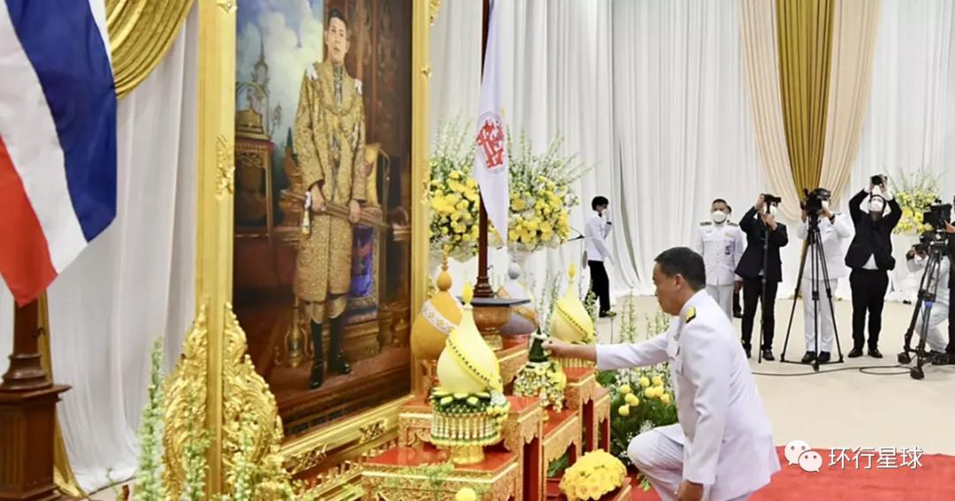 赛塔在任命仪式上向泰王肖像行叩拜大礼