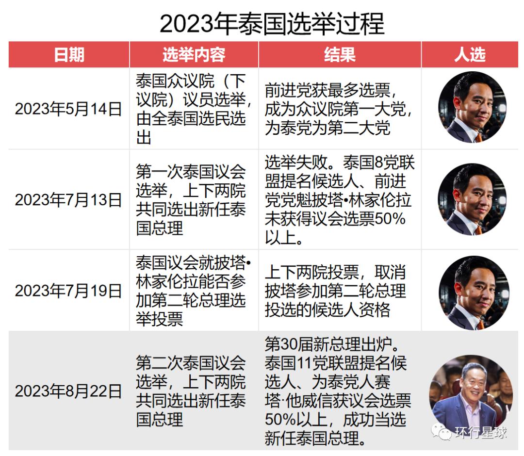 这届泰国总理选举历时3个多月,共3轮投票。泰国两院共747席,须获得总席位的50%,即至少374票,才能跨过拜相门槛。赛塔最终获482票,即总数的64.5%,这其中有152张来自军方委任的上议院议员。2023年泰国选举过程