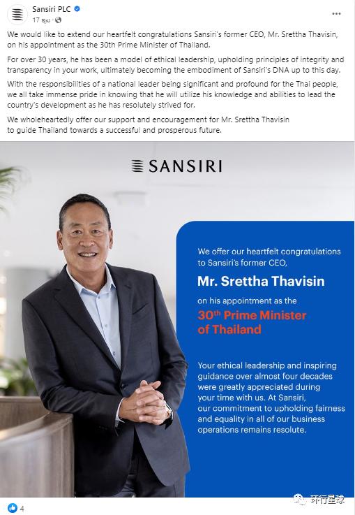 即使在为泰党内部,赛塔也并非最闪亮的星。在当选总理前,甚至很多人不知道他是谁。这位身高1.92米,步入政坛仅175天的新总理,就在半年前,泰国人对他的印象还是房地产大亨、尚思睿(Sansiri)的老板。