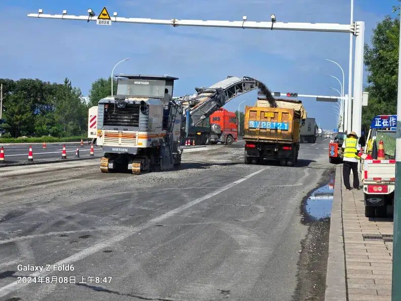 黄海路(疏港公路)建成于2010年,是目前潍坊港货物集疏运的主要公路通道,连通港口与潍日高速、S309田高线(香江大街)、县道X030央营路(长江大街)及周边产业园区,承担的货运通道功能极其重要。自建成以来,每天的货运车流量较大,近期受连续降雨影响,西半幅路面坑槽、车辙等病害问题加剧,影响车辆通行安全。8月12日清晨至夜间,养护单位由北向南采取流动作业方式,对黄海路滨海全段实施坑槽挖补和车辙处置。本次施工主要是西半幅路面病害严重位置挖补维修,集中出动人员26名,铣刨机、运输车、清扫车、摊铺机、压路机等10余辆机械,共处置面积约1400平方米。