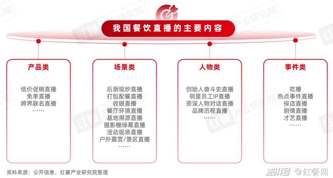 为了进一步打造差异化,增强粉丝粘性、助力品牌出圈,餐饮商家引入经典人物,打造沉浸式实景,讲述吸引力强的故事,例如采用活动现场直播、创始人直播、剧情直播等。由此,我国餐饮直播逐渐形成了产品类、场景类、人物类、事件类等四大主要内容。