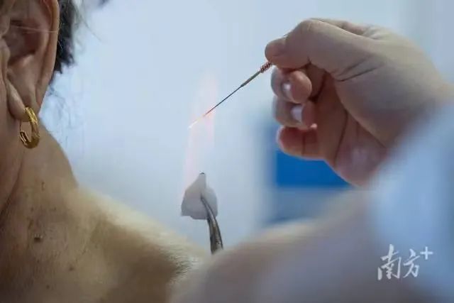 翁颖运用火针为病人做治疗。“若不是家门口就有翁医生,这些小毛病我们可能就拖过去了。时间久了,可能会出大问题。”一旁的刘艳梅频频点头。