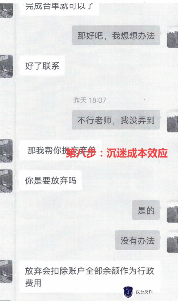 这一步就是今天给大家重点要普及的知识:沉没成本。骗子告诉受害人,如果不接着做的话,之前投进去的5000块钱全都要损失。