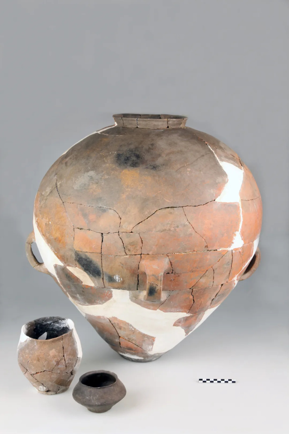 整齐划一的房址展现了先人们静谧、规整的居住环境,房址内成堆摆放的破碎陶片更便于我们嗅到千年前的生活气息。最有特色的器物非出土的陶瓮莫属,最大腹径65.8厘米,高72厘米,3000年前的黑土之下竟尘封着如此庞大的器物,这不仅仅是视觉上的冲击,更是先人们精湛技艺的闪现!这种口大底小的造型是对工匠技艺的严苛考验,残缺后将断茬磨圆的口沿一方面表明多次利用下对陶器的珍视,又在一定层面上反映出先人们磨制技术的成熟。