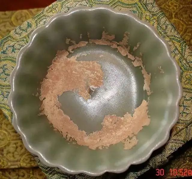 這種土蝕的痕跡最根本的壹點就是要有貼骨的感覺,就是說泥土和瓷胎、瓷釉貼合得非常緊密。因為任何壹件東西埋在地下只要經過幾十年以上,沒有幹擾處於壹種全封閉的狀態,隨著地下水位的升降、時間的沈積,土壤壹定是結實的。如果我們看到瓷器上裹著的土肉眼看上去呈顆粒狀,那麽這件瓷器是贗品的可能性就比較大。