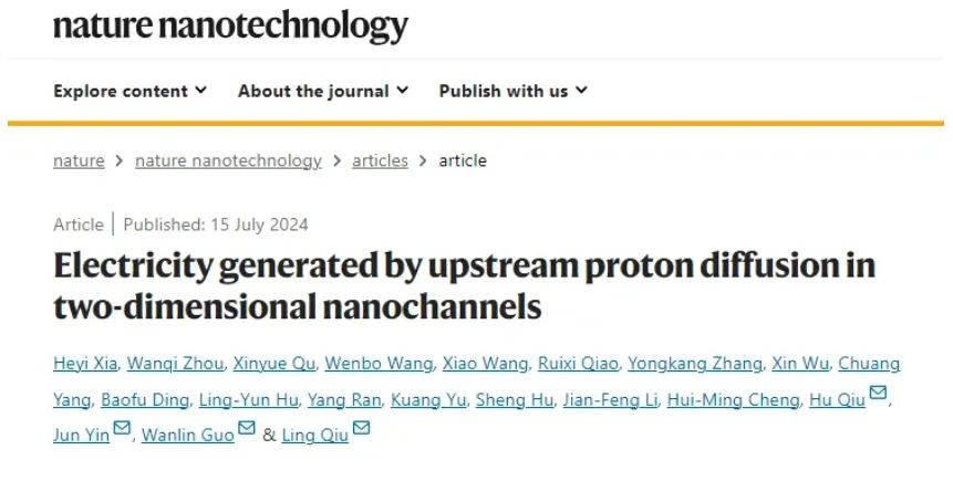 Xia, H., Zhou, W., Qu, X. et al. Electricity generated by upstream proton diffusion in two-dimensional nanochannels. Nat. Nanotechnol. (2024).