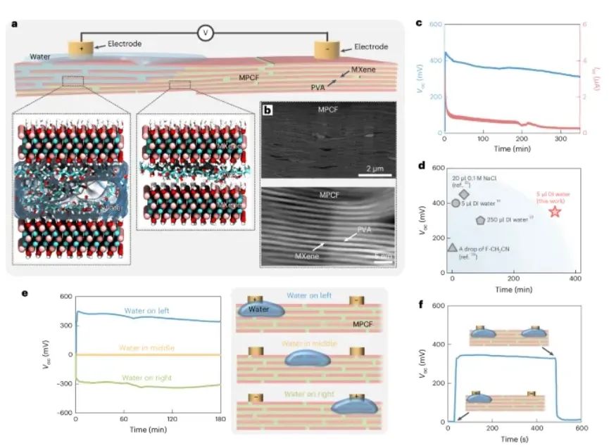 其次,研究强调了材料的结构设计对电能生成效率的影响。MXene/PVA复合薄膜的使用展现了其在水伏应用中的潜力,其超薄和柔性的特性为可穿戴设备的发展奠定了基础。这种材料的组合不仅提升了电能输出的持续性,还使得设备在各种实际应用环境中更具适应性。