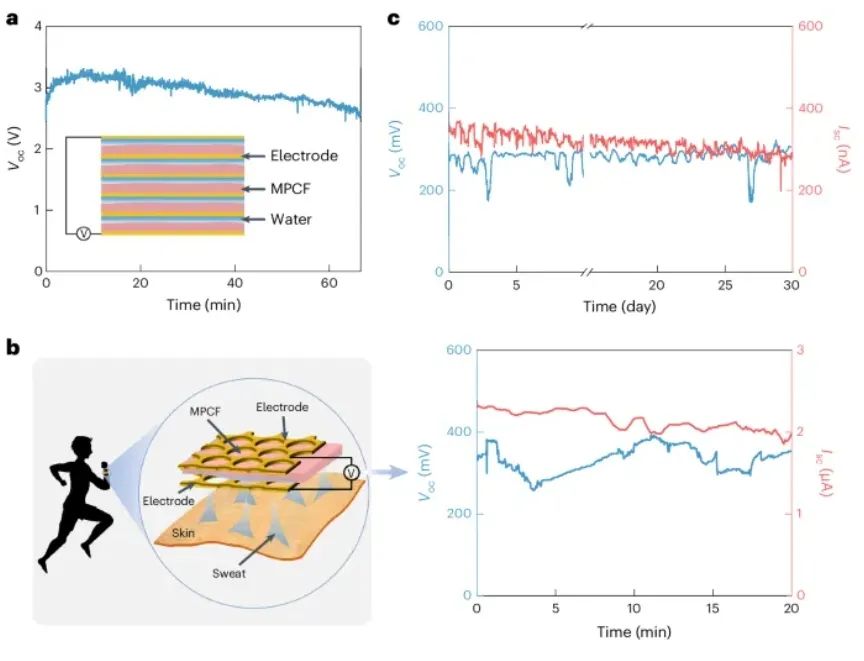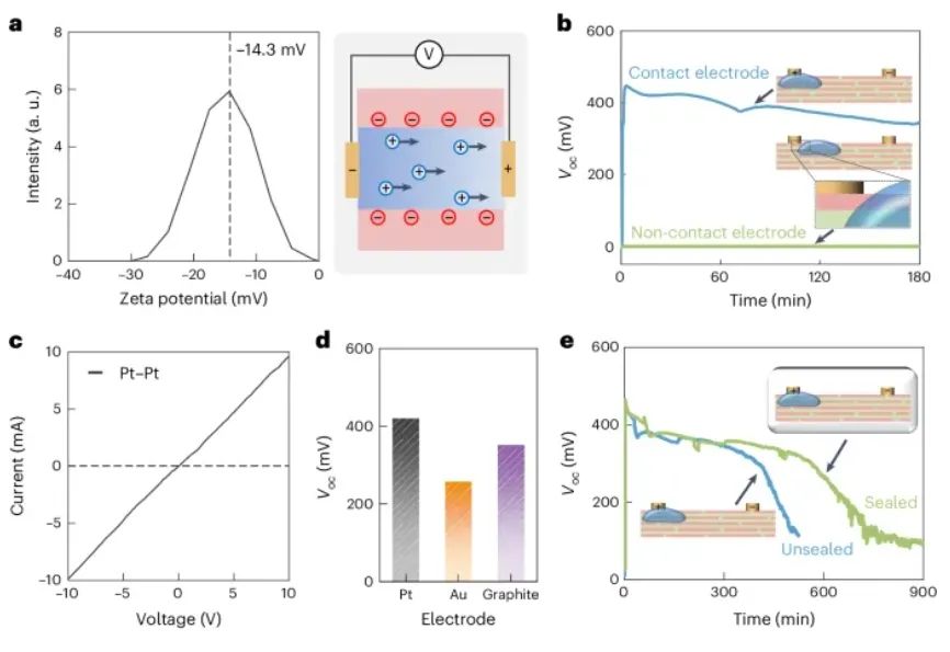 (2)实验通过将水滴渗透到纳米通道中,观察到水的渗透导致通道表面官能团的质子解离,进而形成高浓度质子。这一过程驱动质子上游扩散,结果显示仅用5微升水滴即可产生约400毫伏的开路电压,并持续超过330分钟,展示了该装置的长效发电能力。