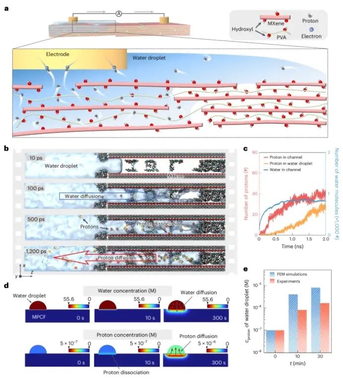 为此,清华大学深圳研究院丘陵副教授联合南京航空航天大学郭万林院士、殷俊教授和仇虎教授合作在Nature Nanotechnology期刊上发表了题为“Electricity generated by upstream proton diffusion in two-dimensional nanochannels”的最新论文。研究团队通过开发一种新型的MXene/聚乙烯醇(PVA)复合薄膜,探索了在二维纳米通道内的上游质子扩散机制。通过将水渗透到通道中,研究人员发现水分子促使表面官能团解离,释放出质子,从而在通道内形成高浓度的质子。这种质子的运动方向与水流相反,形成了上游质子扩散,进而生成电能。实验表明,仅用5微升的水滴,便可持续产生约400毫伏的电压,长达330分钟以上。