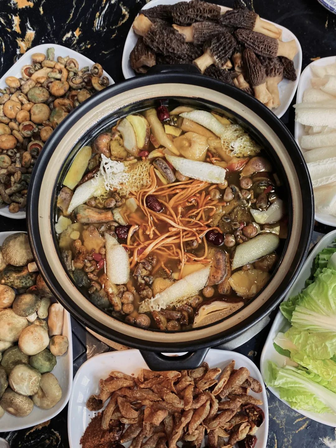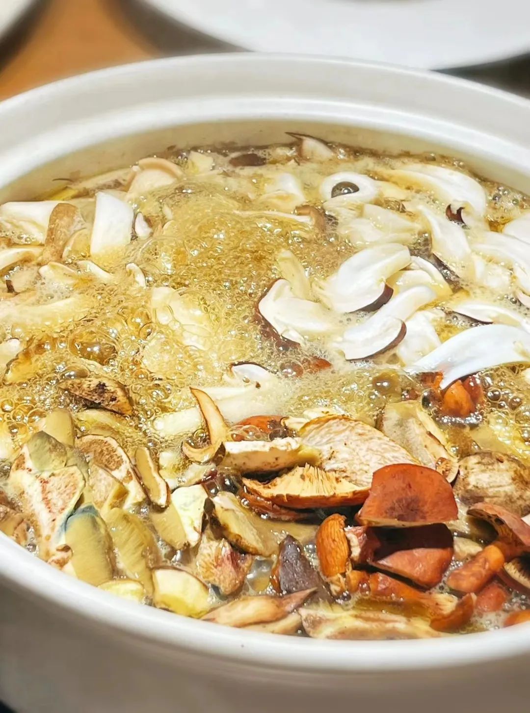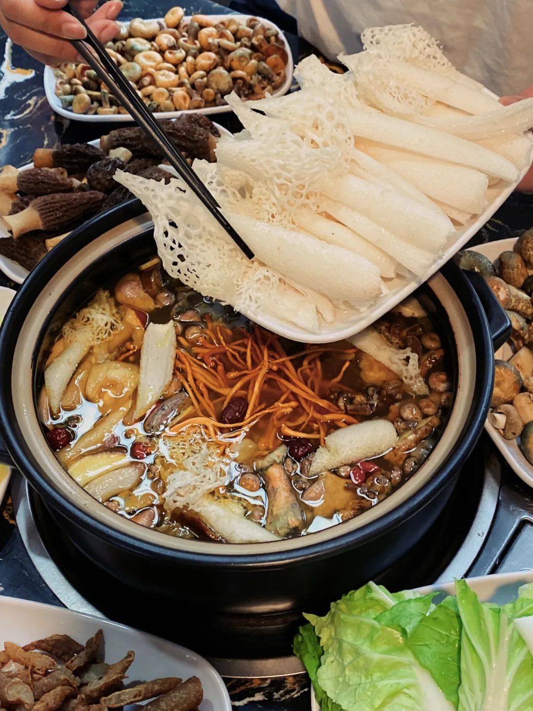 里面菌汤是最好喝的,时间不到你别想掀开锅,汤底变成了奶黄色,喝一口鲜到飞起。