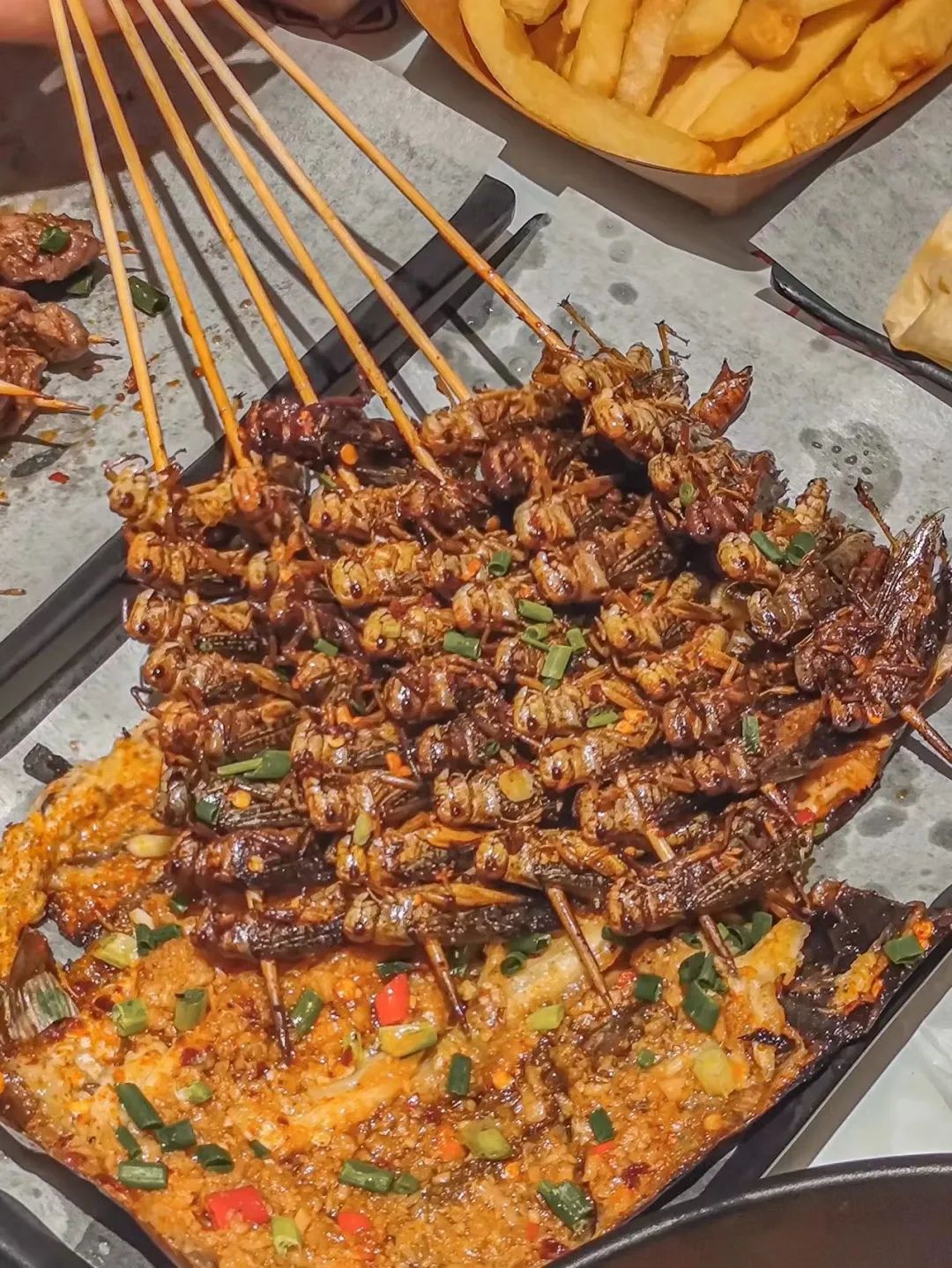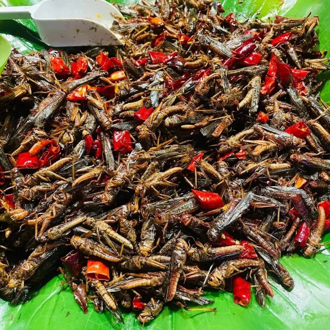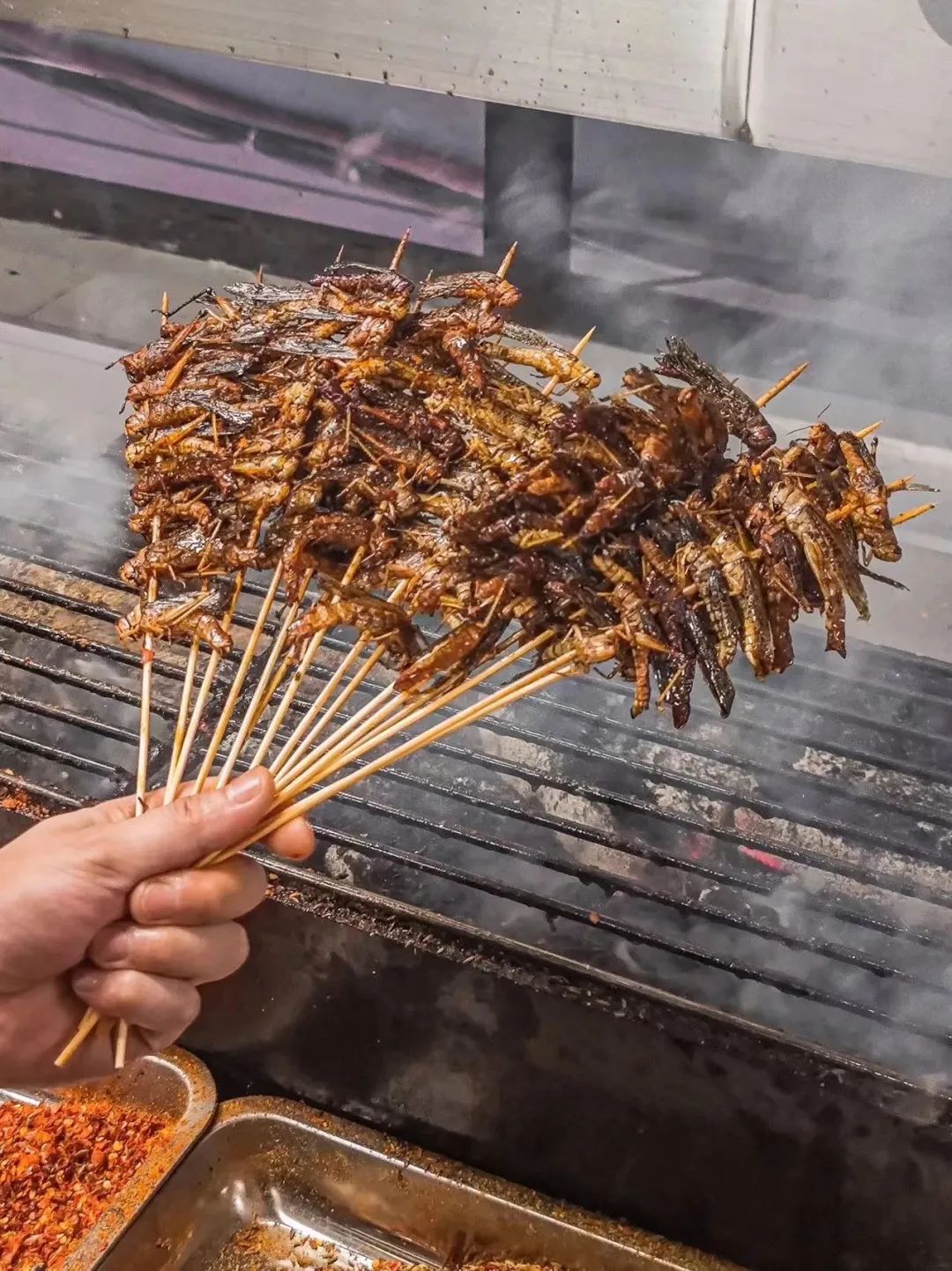 除了油炸,还有烤蚂蚱。在大理的烧烤摊子上随处可见,经过炭火烤制的蚂蚱,刷上酱料,吹着云南和煦的风,忍不住就吃了好几串。