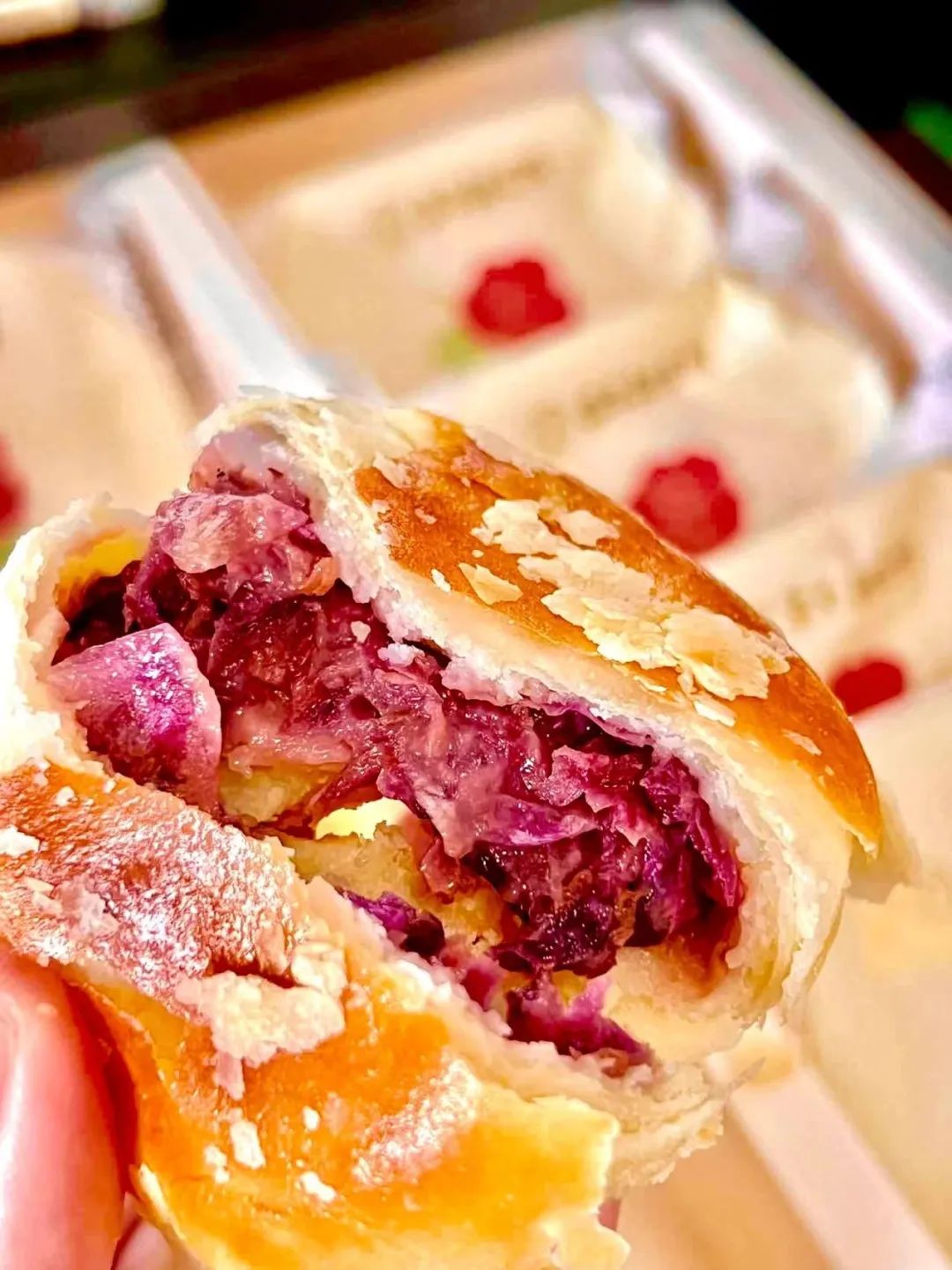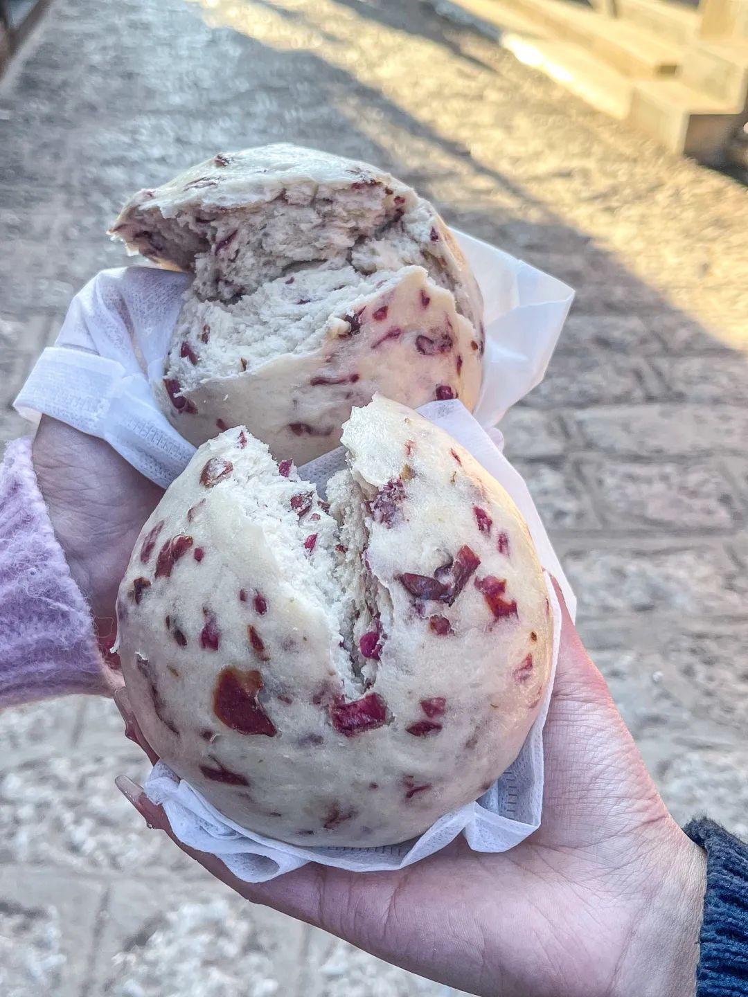 在丽江还有玫瑰馒头。超级大一个,胃口小的吃一个能顶一天。里面的玫瑰馅很满,很有嚼劲。