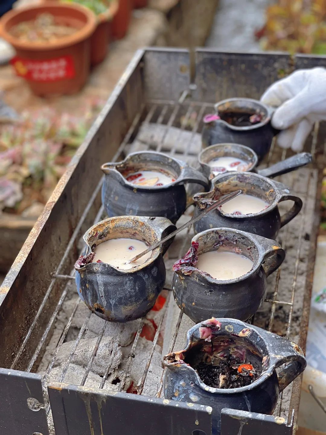 在白沙古镇,还有用玫瑰花做的奶茶。火炉上放着陶罐,陶罐里煮着当地的新鲜牛奶,加上茶叶、红枣。虽然没有加一点糖,却一点都不苦,还有花的清香。