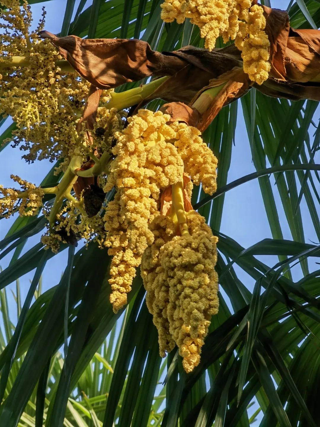 棕树花,剥开包着的棕壳。里面一粒一粒的像鱼籽的东西,可以用来炒肉。