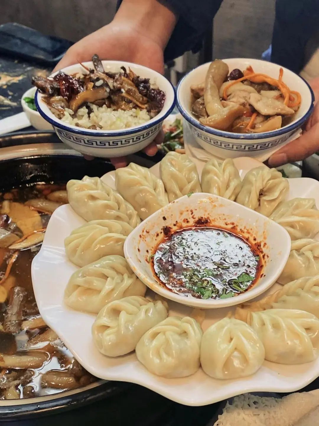 入门级的菌子美食,有菌子火锅、菌子炖鸡、还有菌子炒饭、以及用菌子包的饺子。