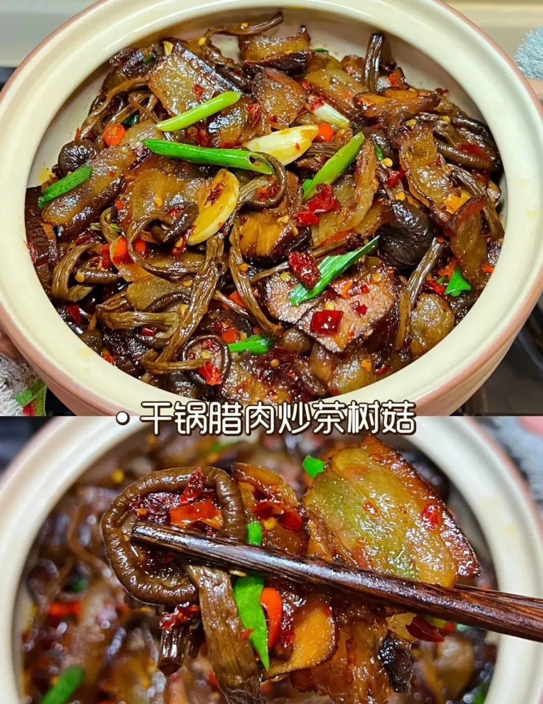 炒干巴菌,一定要用青椒,这样菌味会更浓;青头菌则适合用红椒加青椒,吃着鲜美可口;茶树菇炒肉,焦香的腊肉和肥腻的菌肉一起咬下,满嘴生香。