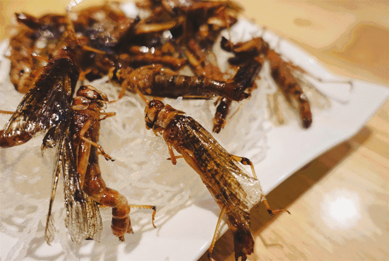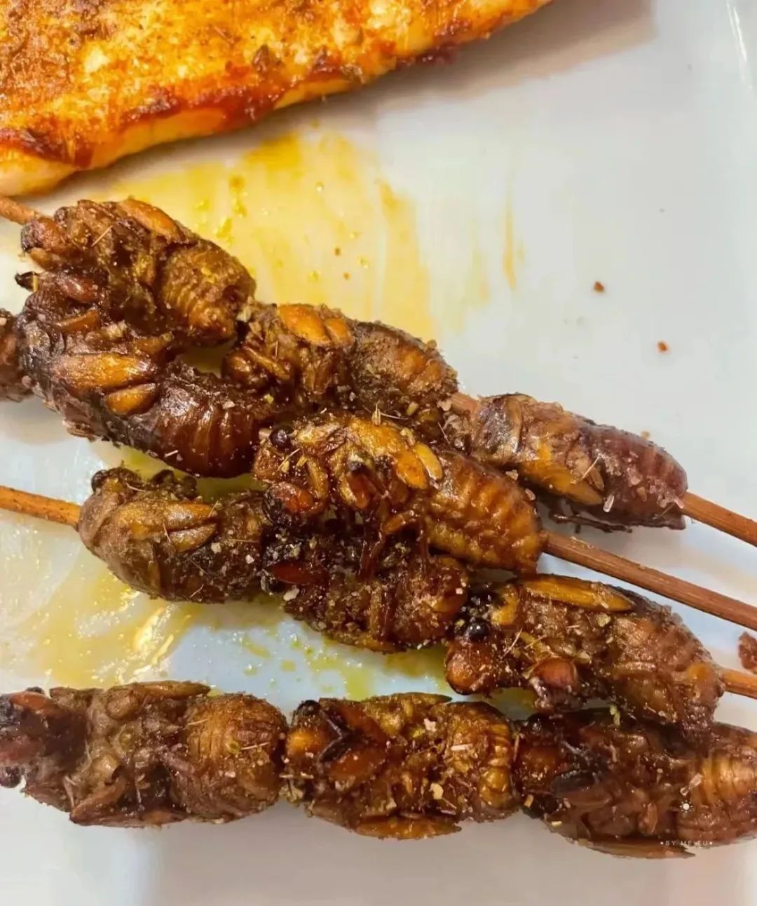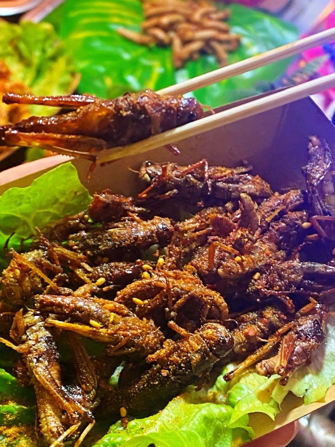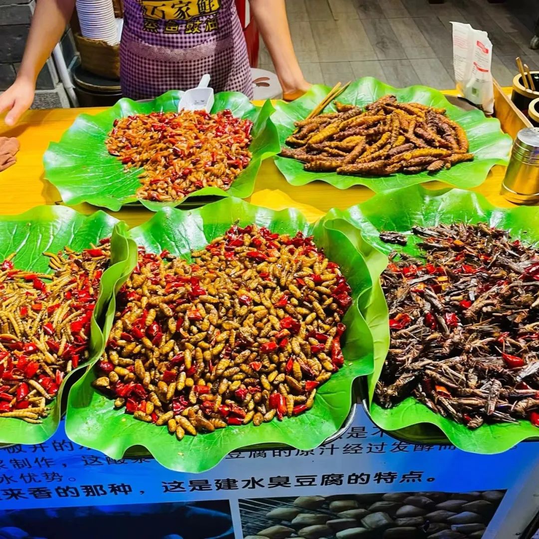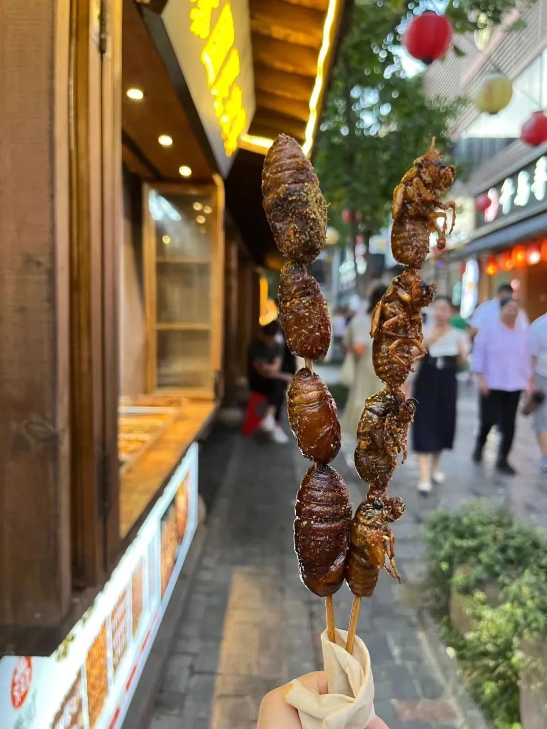 初入大理最常见的虫子美食便是一串炸蚂蚱。