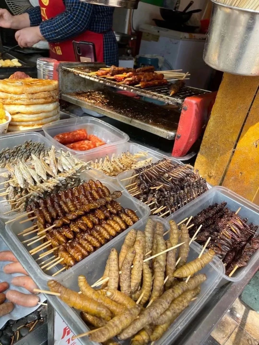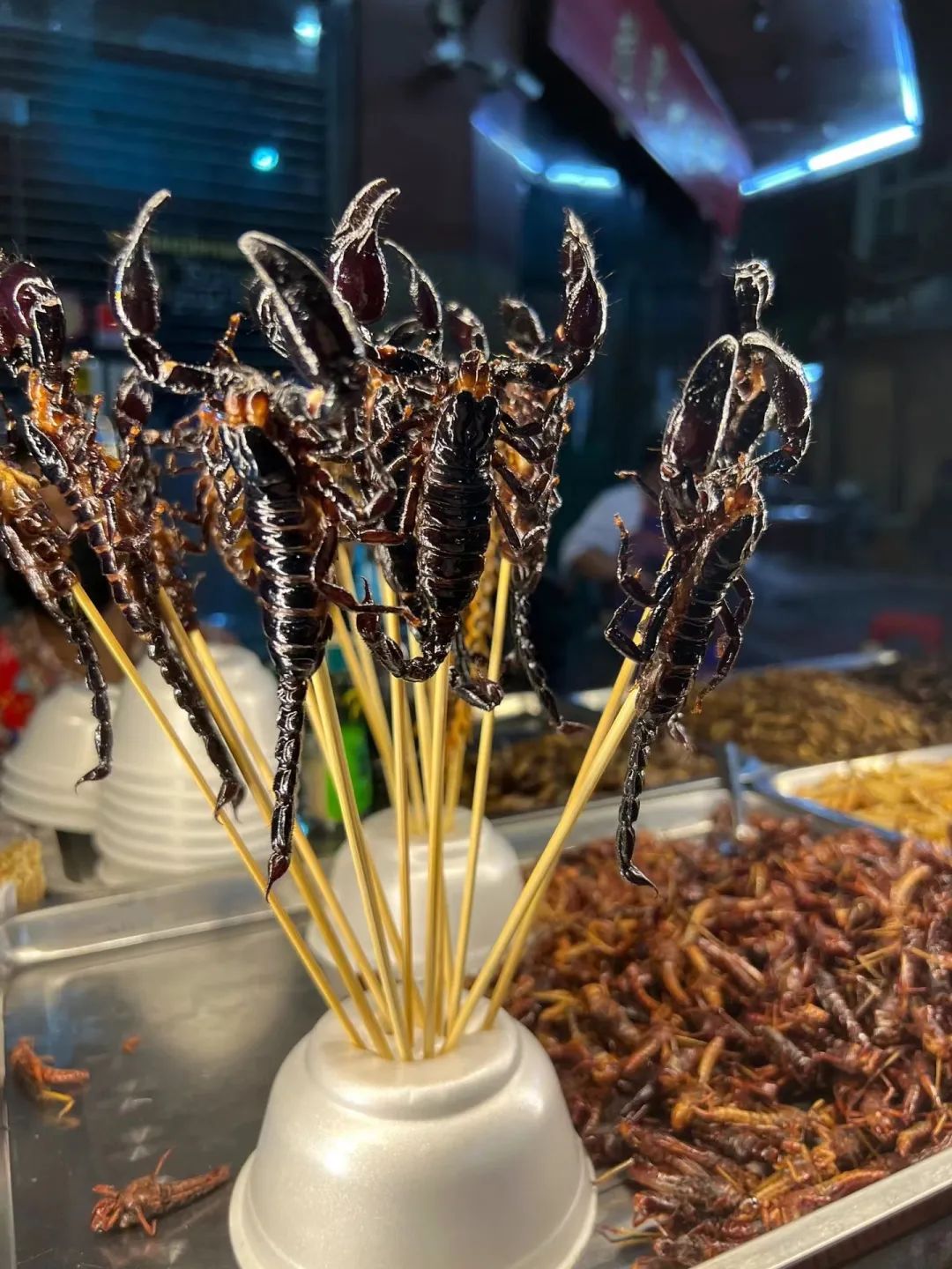 除了蚂蚱,常见的还有蚕蛹、蝎子。炸蝎子、蚕蛹,金黄酥脆,一口一个,用来下酒刚刚好。