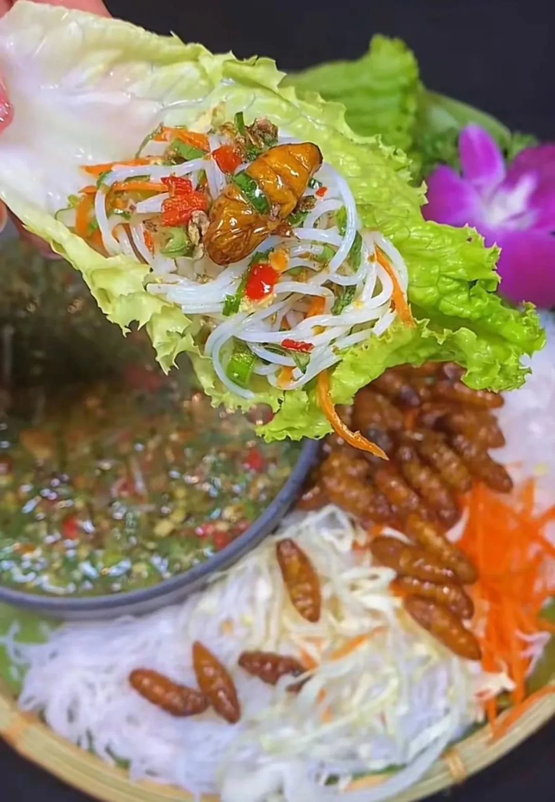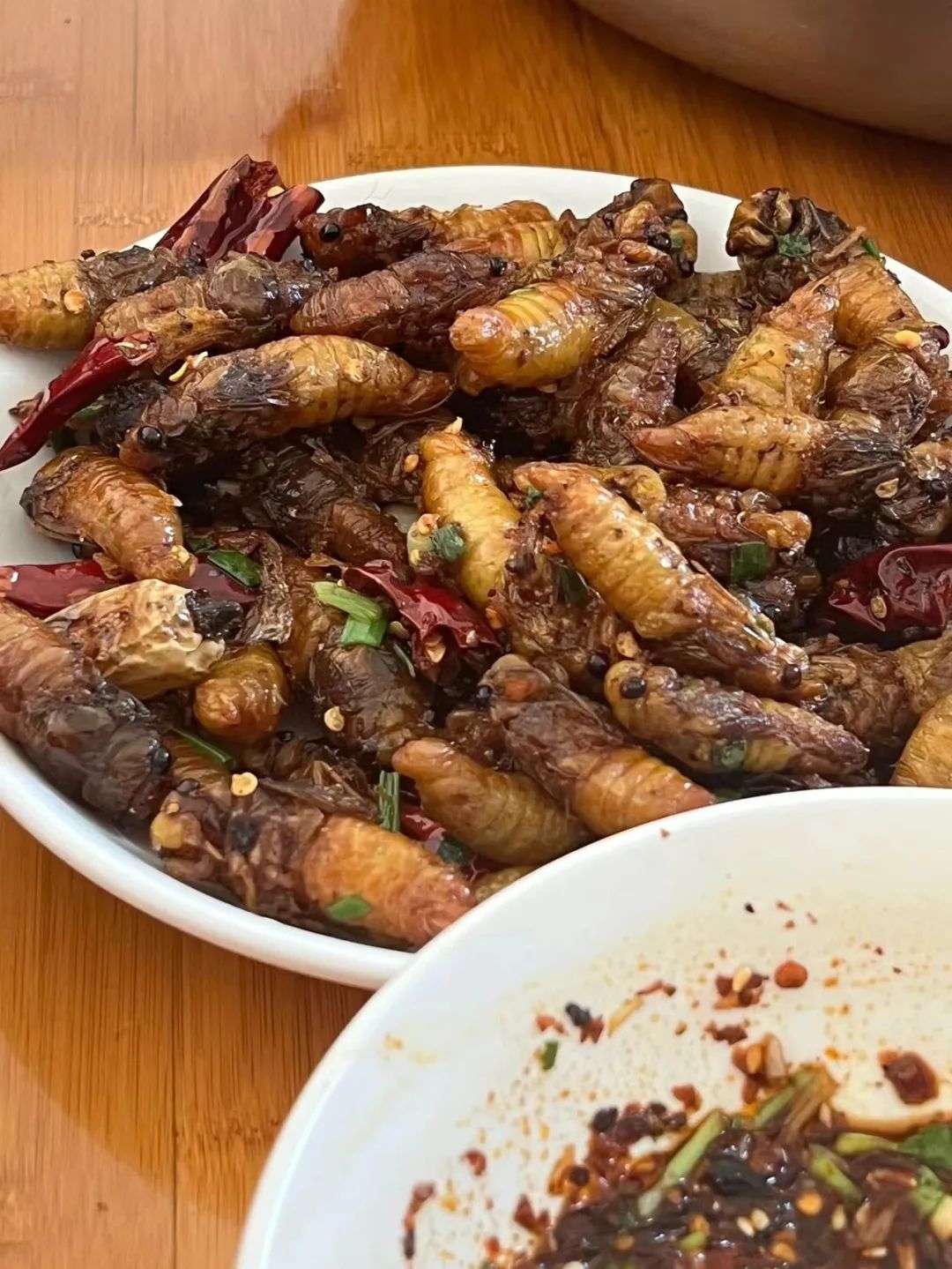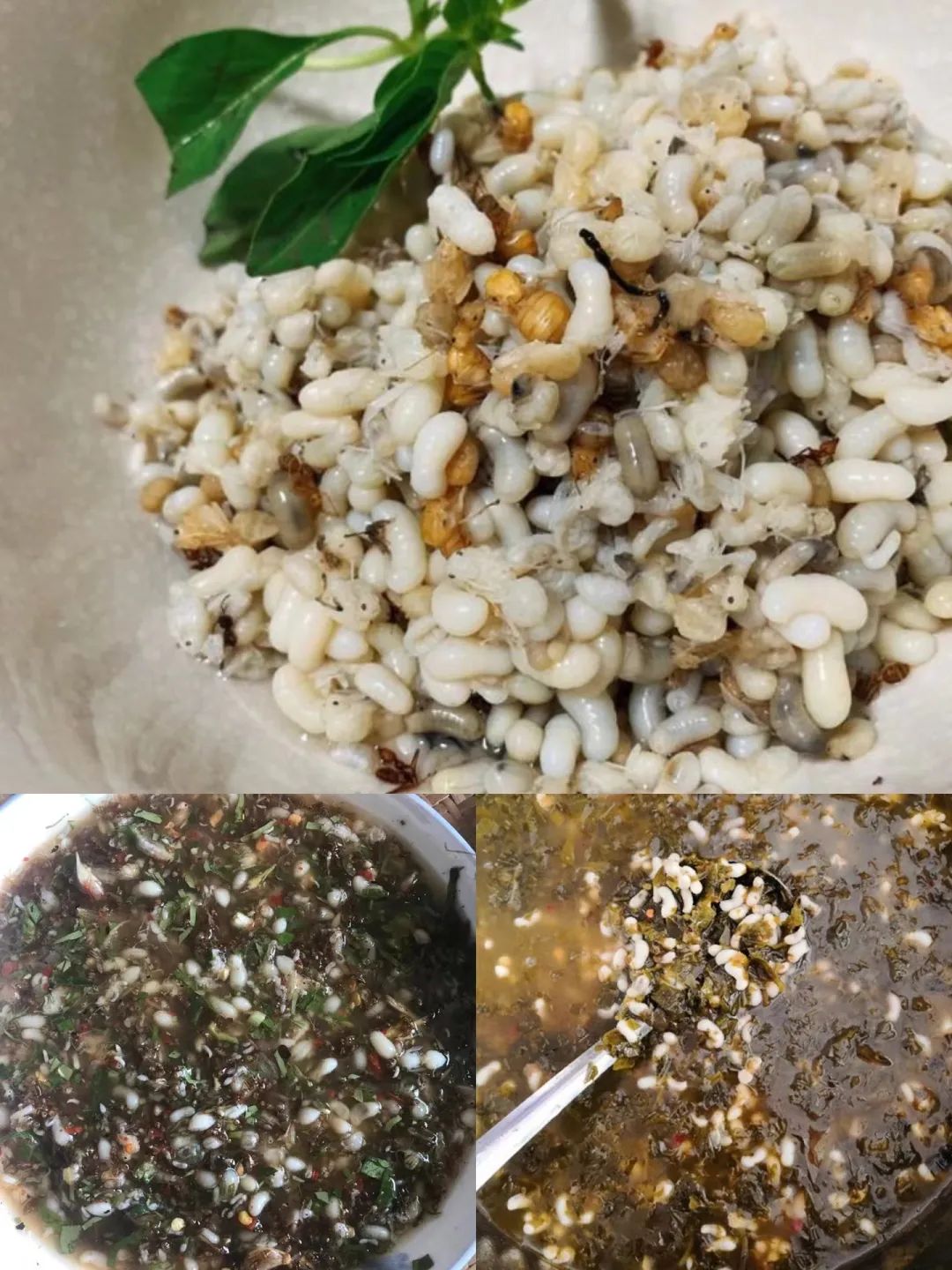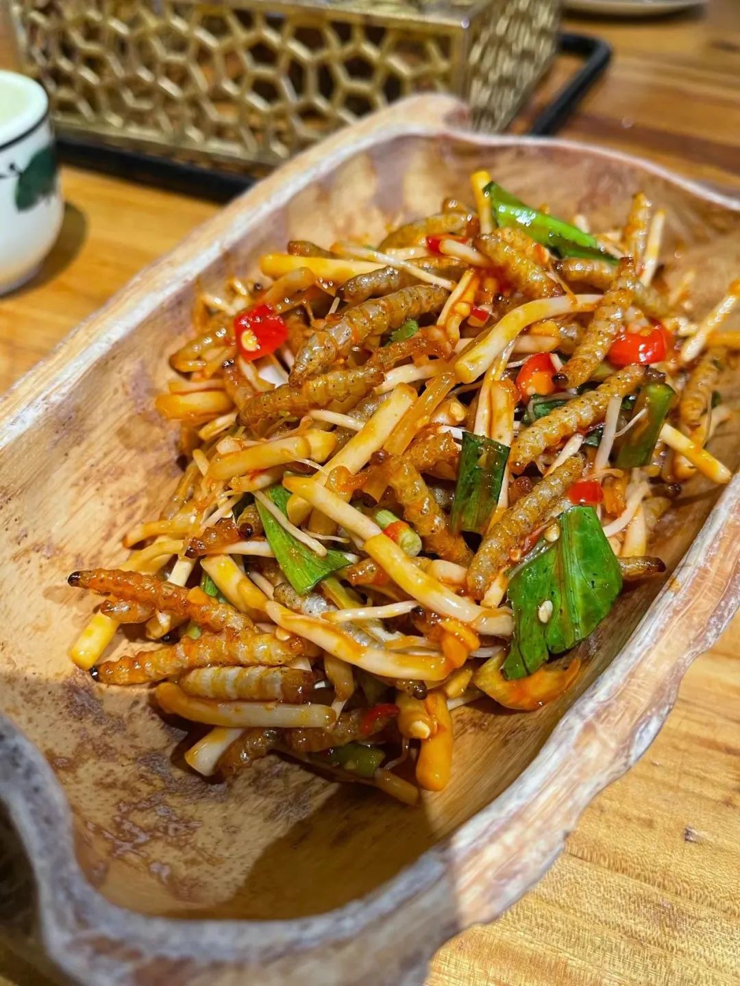 小小长长的竹虫一口一个,嘎嘣脆,竹虫还能生吃,体验它在嘴巴里瞬间爆浆的刺激。