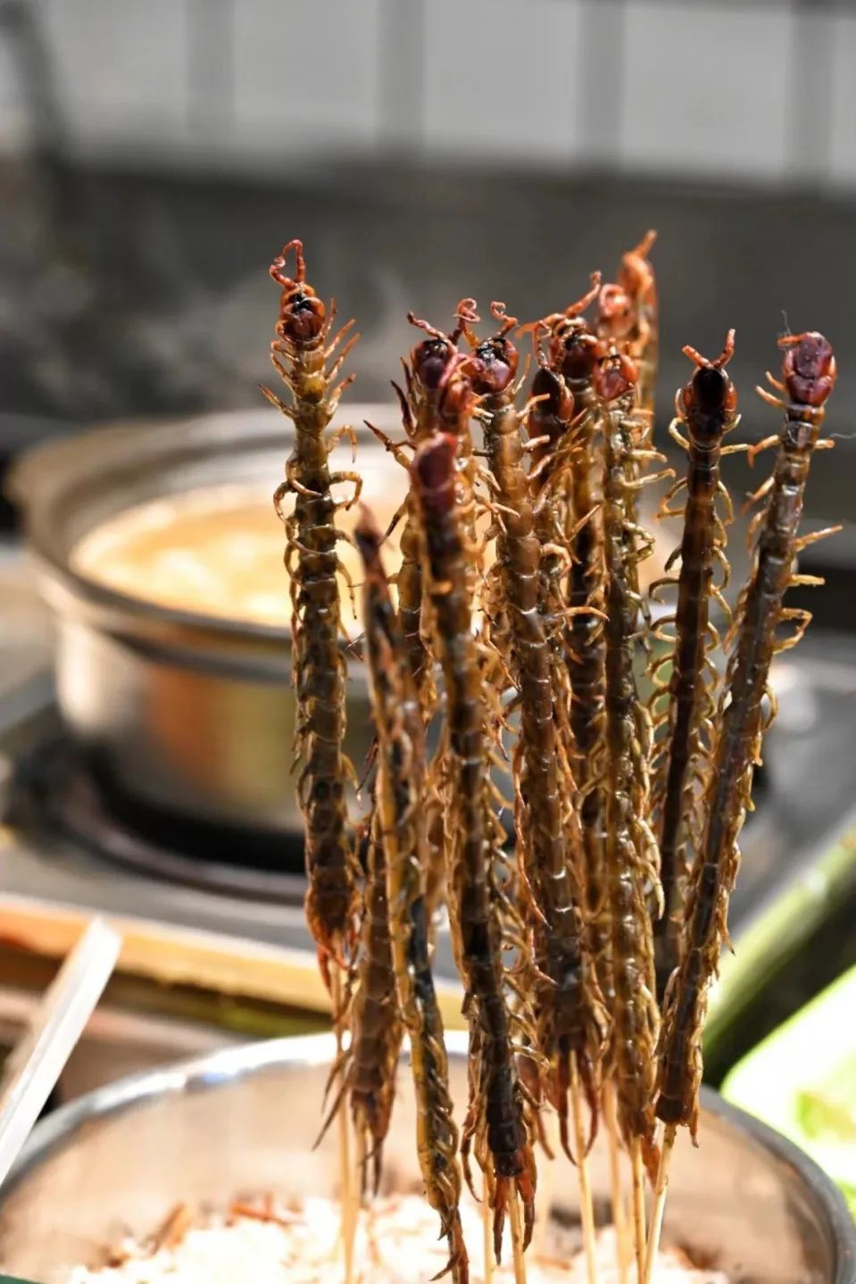 几十块钱一只的长蜈蚣、大蝎子,也都是用高温热油炸制的。咬上一口香香脆脆。
