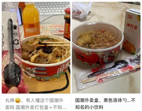但这次人们被刺到的原因并不一定是因为价格,更大概率是担忧外卖的卫生状况。有网友总结,雷同的国潮包装、软到能把饭弹回脸上的勺子、超细的毛细筷子、薄到可以透过光的餐巾纸以及好评返现卡片,并称为构成“国潮外卖”的充分必要条件。