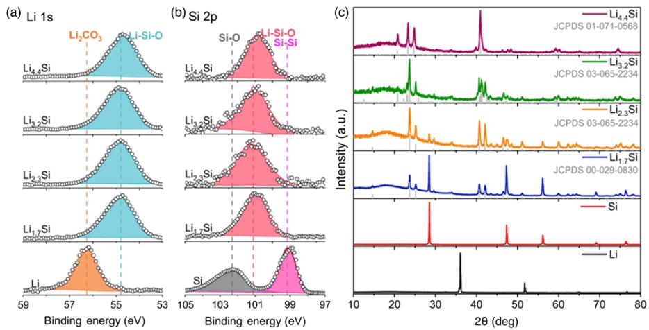 本文通过固相反应合成了一系列锂硅负极,即Li1.7Si、Li2.3Si、Li3.2Si和Li4.4Si,合成方法如图1所示。如图2 X射线衍射图和X射线光电子能谱(XPS)所示,固相反应中Li全部被完全消耗,反应后的锂硅合金与标准卡片特征峰匹配良好(图 2c)。