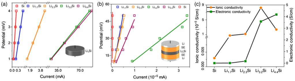 图2. LixSi负极的XPS光谱(a) Li 1s、(b) Si 2p 区域和 (c) XRD衍射图随后,系统研究了LixSi和Si的电子、离子电导率。Si的电导率为0.5×10-2 S cm-1,LixSi的电子电导率随锂含量的增加而增加。与纯Si相比,锂化后电子电导率提高近35-700倍(图3a)。对于离子电导率,LixSi大致都处于10-5 S cm-1这一数量级。其中,Li3.2Si的离子电导率最高,为8.2×10-5 S cm-1,是纯Si (2.9×10-8 S cm-1) 2800倍(图3b)。与仅单向传输的Si不同,使用LixSi作为ASSBs的负极时,由于其本身具有较高的离子电导率和电子电导率,不仅自身能够形成连续的电子导电路径,而且还能与SE形成连续的Li+传输路径。