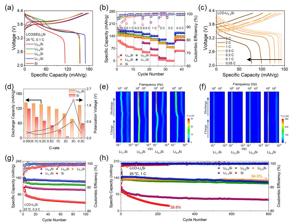 如图4b-c所示,以Li2.3Si负极为例,展现出优异的倍率性能,在2 C的电流密度下放电容为99.3 mAh g-1。当电流密度恢复到0.3C时,容量恢复到134.5 mAh g-1。良好倍率性能源于LixSi是混合导体,能够维持长程离子/电子渗透,从而促进Li向电极内部的扩散流动。此外,具有锂硅合金的电池也展示出优异的长期循环稳定性(图4g-h)。含有Li2.3Si的电池在1 C电流密度下,循环800圈后,容量保持率达94%。LixSi的硬度和强度低于Si的硬度和硬度,因此,可以避免SE和LixSi界面的退化和损伤,维持离子电子传输通路的稳定。