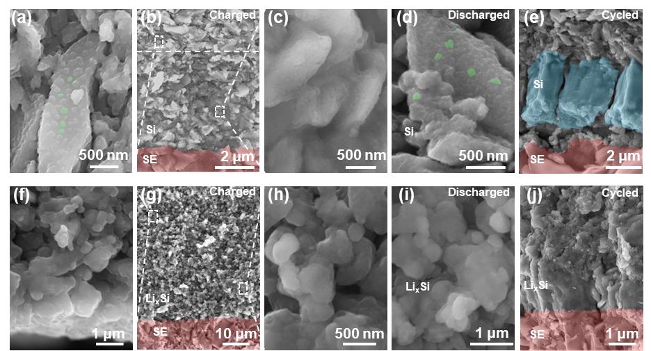 图4. 不同负极的(a)首次充放电曲线和(b)倍率性能。(c) Li2.3Si负极在不同倍率下的充放电曲线。(d) Si和Li2.3Si在不同电流密度下的放电容量和极化电压对比。(e) 第 1 次循环和 (f) 第 100 次循环充放电过程中 DRT 曲线。不同阳极在 (g) 0.3 C 和 (h) 1 C 下的循环性能比较了不同充放电状态下LixSi和Si负极的形态演变。如图5b所示,充电后的Si负极呈现出两种区域。靠近SE层的Si锂化较完全,如图5c;而远离SE层的Si颗粒则利用率很小 (图5a)。这种现象是由于Si是逐渐向电极深处锂化的,界面处对应着更大的体积膨胀,造成应力集中。而放电后,如图5d所示,Si可逆性差,不能完全脱锂,这些不可逆的锂是Si负极CE低的主要原因。界面处反复的体积膨胀/收缩使界面出现了严重的裂纹(图5e),导致严重的性能衰减。而LixSi负极,得益于形成的三维离子-电子导电系统,即使不添加额外的电解质和导电剂,其本身具有的高离子电子传输能力也足以构成全化学活性的电极,电极反应发生在电极整个区域上,对应了较低的膨胀率,有利于电极界面保持稳定,促进了电池循环稳定性(图5f-j)。