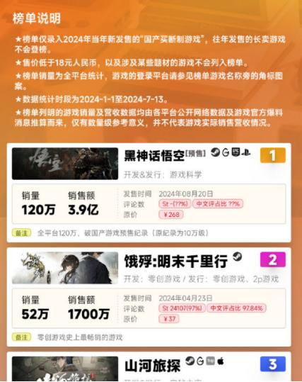 根据国游销量榜发布的《2024国游销量半年榜》,截至今年7月13日,《黑神话:悟空》累计销量120万份,销售额3.9亿元,破国产游戏预售记录。作为对比,该榜单只收录当年新发售的“国产买断制游戏”,排在黑悟空之下的第二名销量52万,销售额仅有1700万。