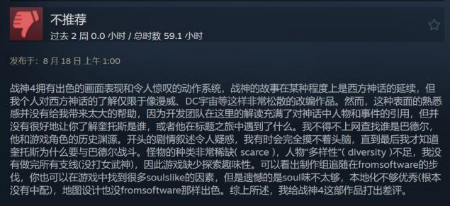 究竟是不是所谓《黑神话:悟空》的粉丝故意刷差评,这件事其实是很难辩明的。只能说8月中旬之前的差评明显少于之后,且8月中旬之后的差评有不少是一模一样的文案。而这段文案,酷似前不久《黑神话:悟空》媒体评测正式解禁后,IGN给出的评语。《战神4》作为一款有代表性的3A游戏,被看作《黑神话:悟空》的对标物。