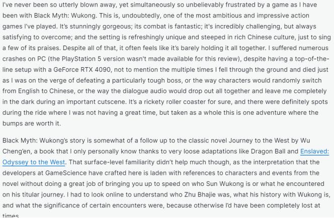 IGN评价在赞美之词之后,指出《黑神话:悟空》的文化门槛问题,称没读过吴承恩《西游记》,很多时候搞不懂游戏的剧情。撰写评语的编辑还提到游玩过程中遇到了崩溃、语言切换后音频出问题、游戏bug等问题,最终为该游戏打了8分。