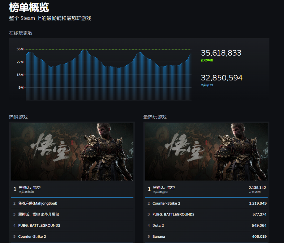 正式发售1小时后,《黑神话:悟空》即登上Steam最热玩游戏榜首,同时在线玩家数突破100万。下午4:00,Steam同时在线超250万,其中超过140万为悟空而来。很难想象,这只是某个普通工作日的上午。而截至晚上9:00,游戏在线人数已超过213万。