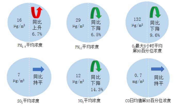 7月,全国339个地级及以上城市PM2.5平均浓度为16微克/立方米,同比上升6.7%;PM10平均浓度为29微克/立方米,同比下降6.5%;O3平均浓度为132微克/立方米,同比下降9.6%;SO2平均浓度为7微克/立方米,同比持平;NO2平均浓度为12微克/立方米,同比下降14.3%;CO平均浓度为0.7毫克/立方米,同比持平。