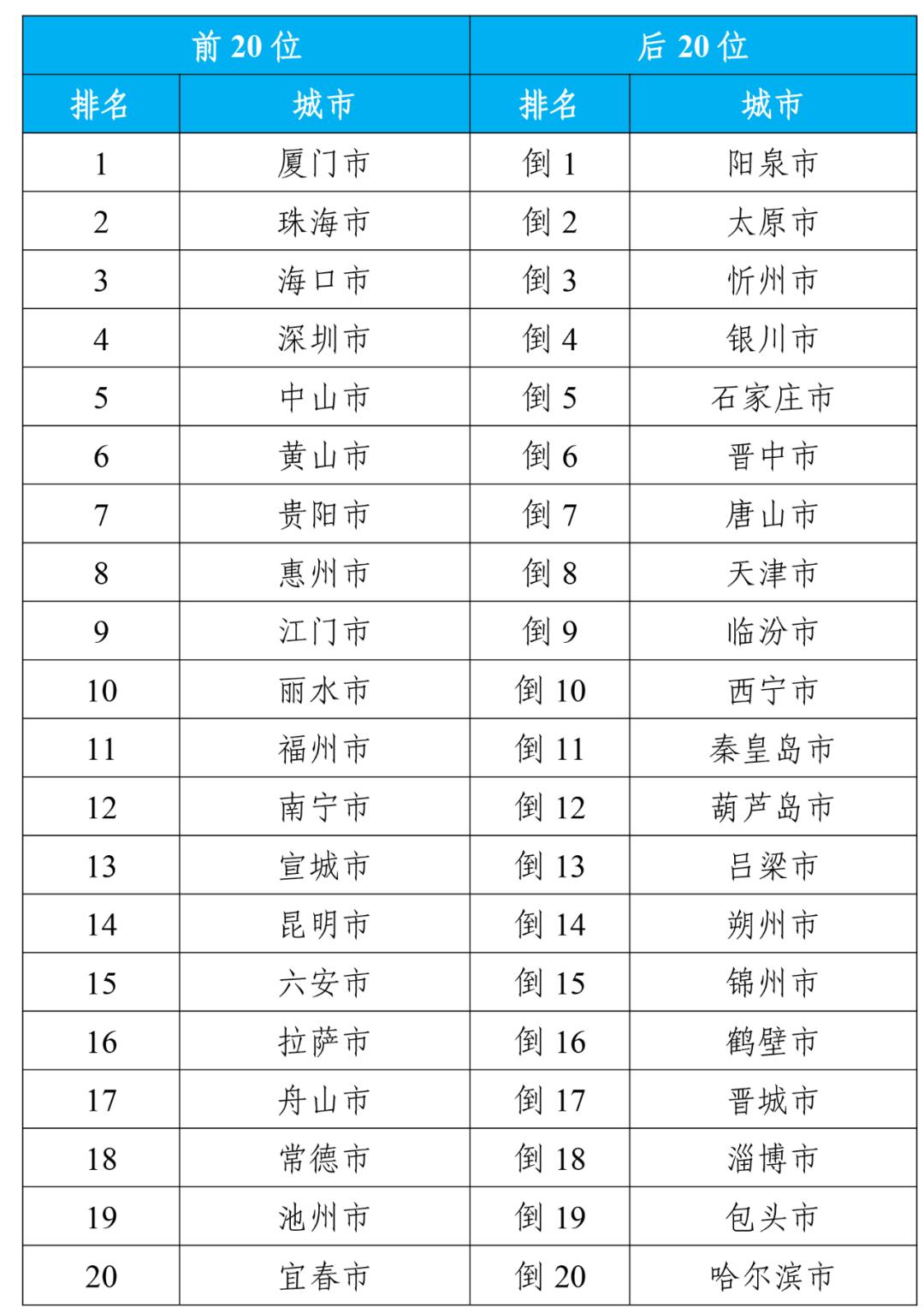 排名前20位和后20位城市名单