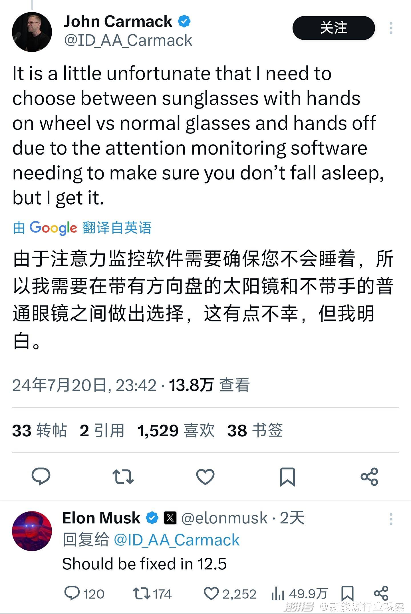 图/马斯克回应戴墨镜驾驶或在12.5实现来源/互联网 新能源观截图