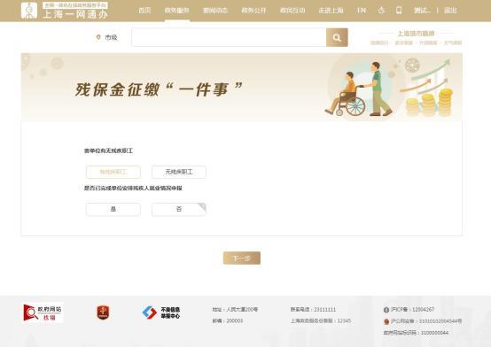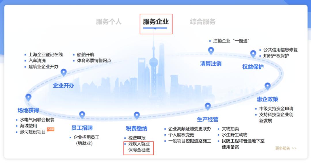 同时也可登录上海“一网通办”PC端(https://zwdt.sh.gov.cn/),进入“特色专栏”,点击“高效办成一件事”,切换到“服务企业”,进入“残疾人就业保障金征缴”,点击“立即办理”,无需申报残疾人就业人数,确认应缴费额信息后,办理残保金申报缴费。