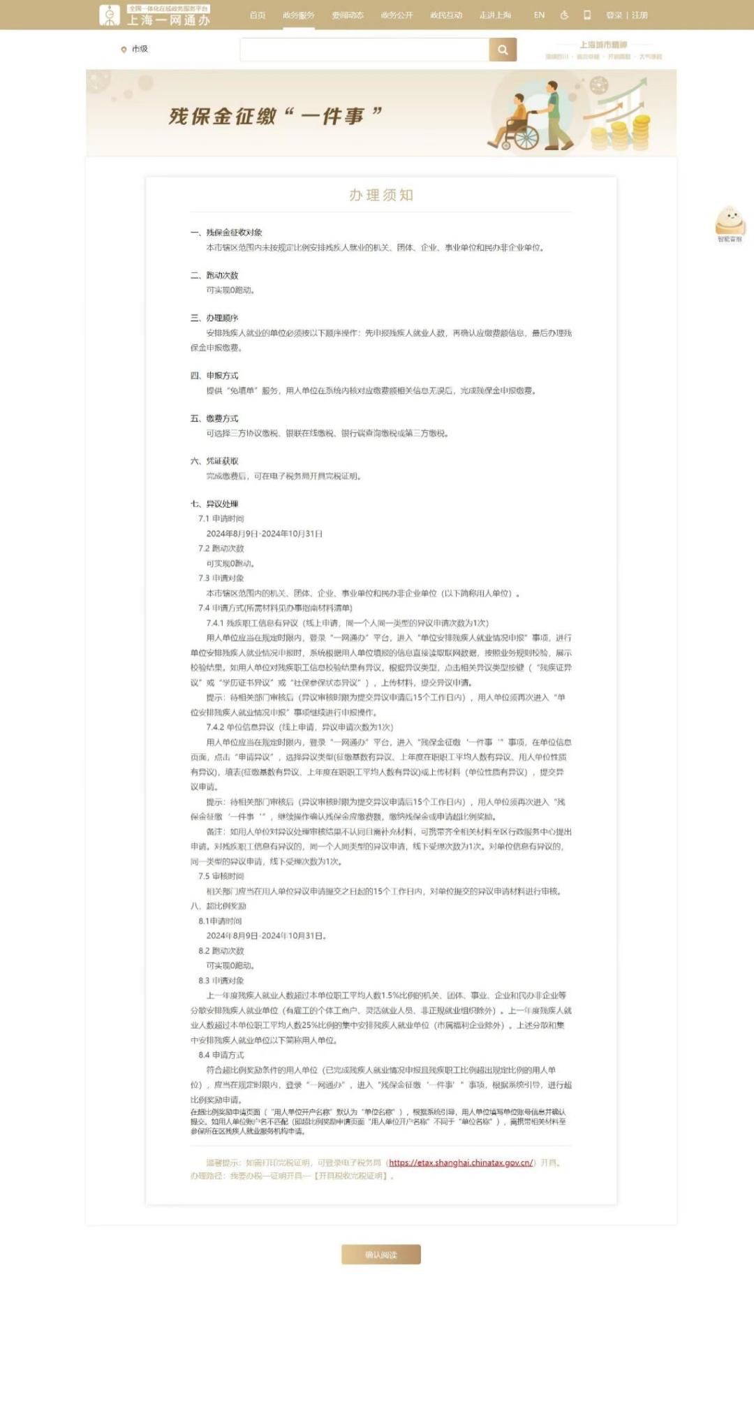 提示:用人单位完成2024年残疾人按比例就业情况网上申报后,用人单位应继续在 “一网通办”平台,搜索 “残保金征缴一件事”,根据系统引导,确认残保金应缴费额,缴纳残保金或申请超比例奖励。四、【办理须知】界面