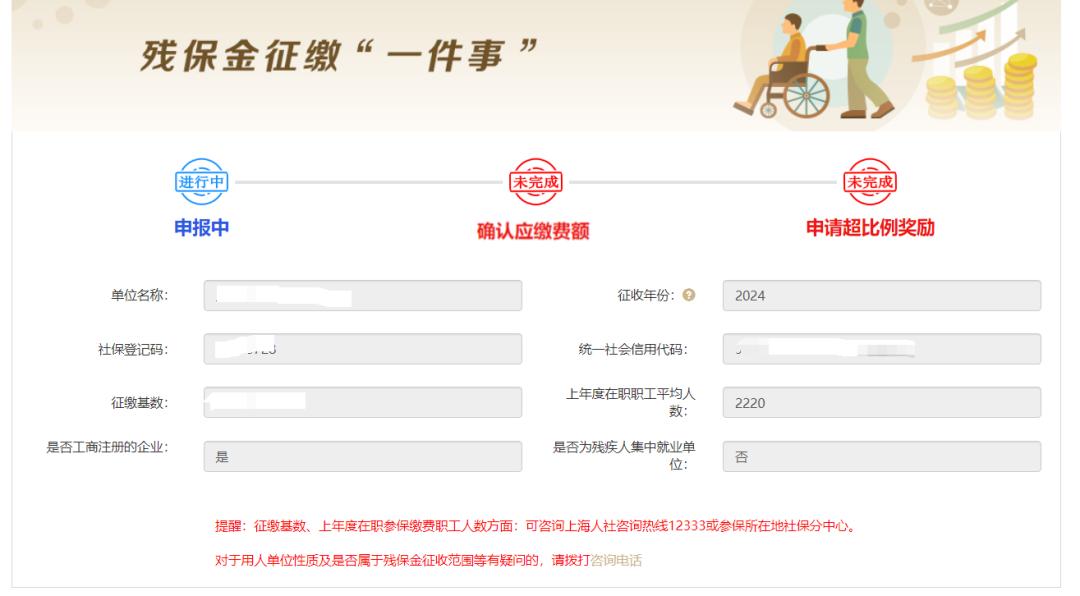 用人单位需要检查此页面展示的单位基础信息。如果用人单位对 “征缴基数、上年度在职职工平均人数、是否工商注册的企业、是否为残疾人集中就业单位”信息存有异议,可通过点击左下角“申请异议”按钮申请进行异议处理。