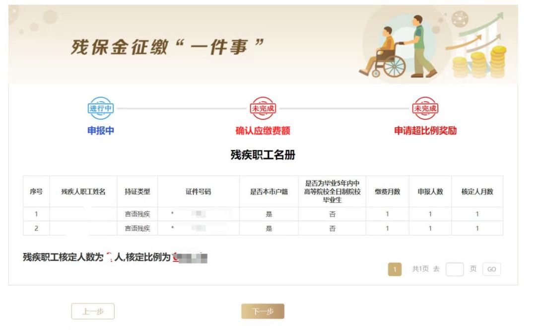 若单位有残疾职工,且没有办理“单位安排残疾人就业情况申报” 事项。可通过智能问卷引导,点击“下一步”按钮,跳转“单位安排残疾人就业情况申报”申报界面。