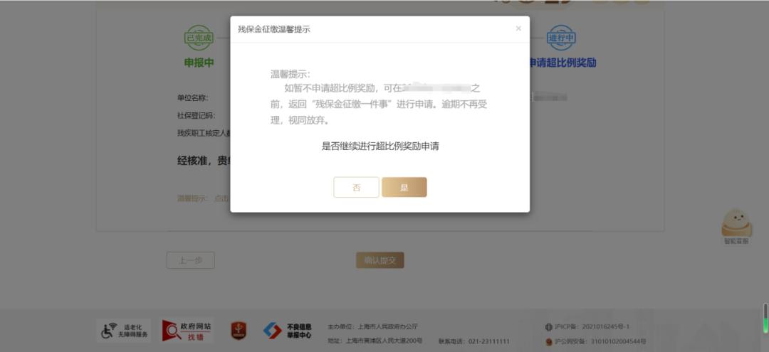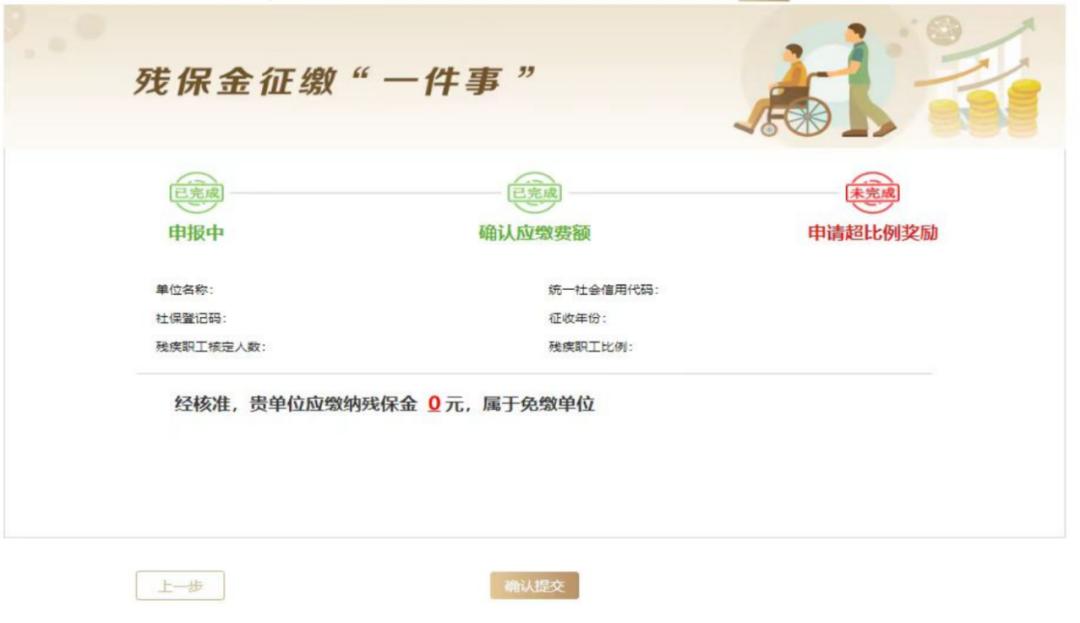 2.如判断单位为“超比例单位”,则单位无需缴纳残保金,点击“确认提交”按钮后,可根据提示选择是否继续进行超比例奖励申请。