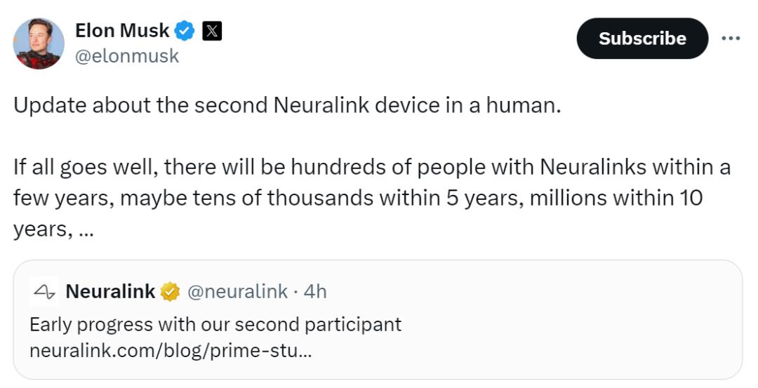 在第二名患者术后良好后,马斯克表示:「如果一切顺利,几年内将有数百人使用 Neuralinks,5 年内可能有数万人,10 年内可能有数百万人……」