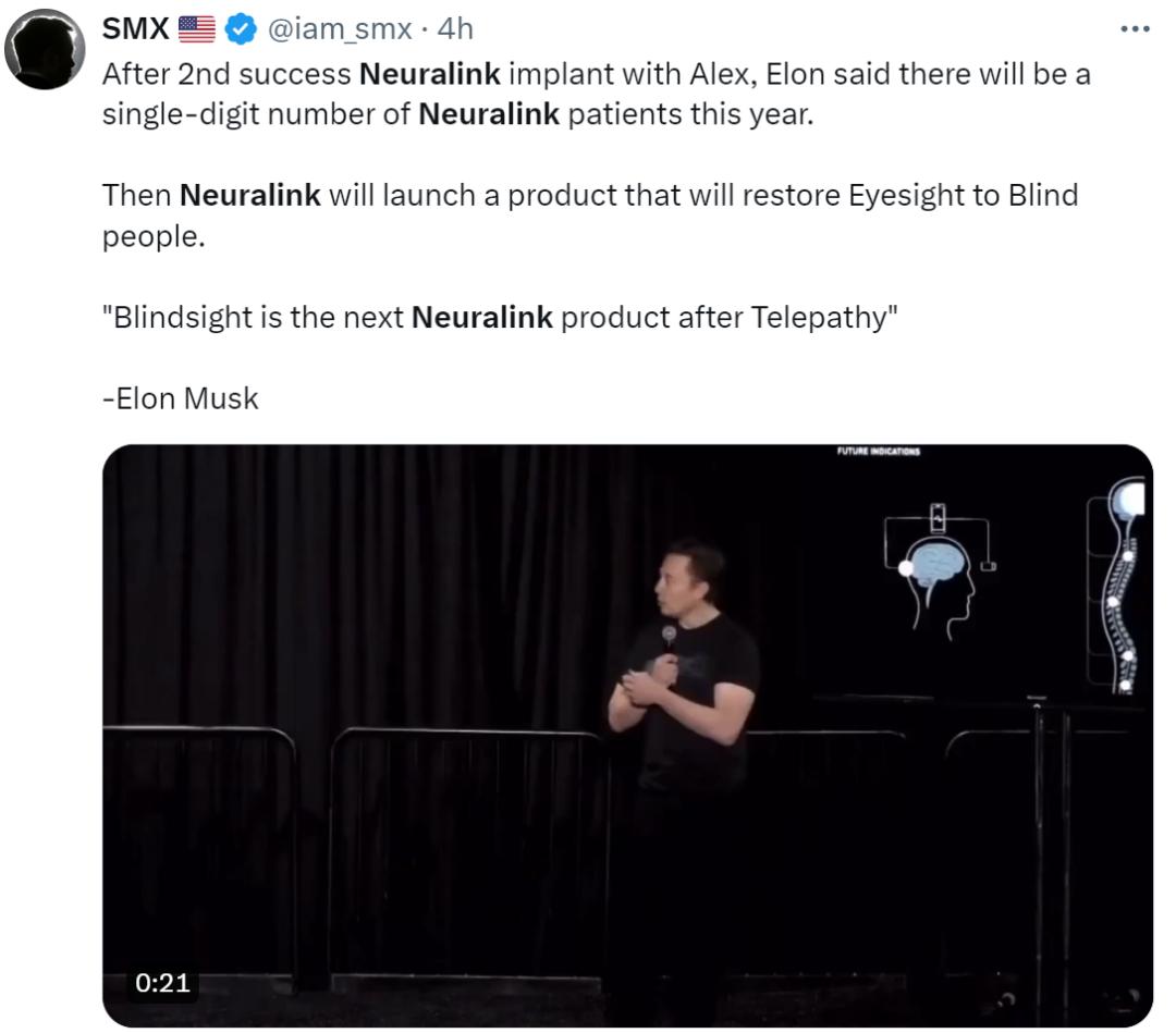 在Neuralink成功完成第二次实验后,马斯克表示,当患者的数量达到个位数后,Neuralink 将推出一款产品,帮助盲人恢复视力。